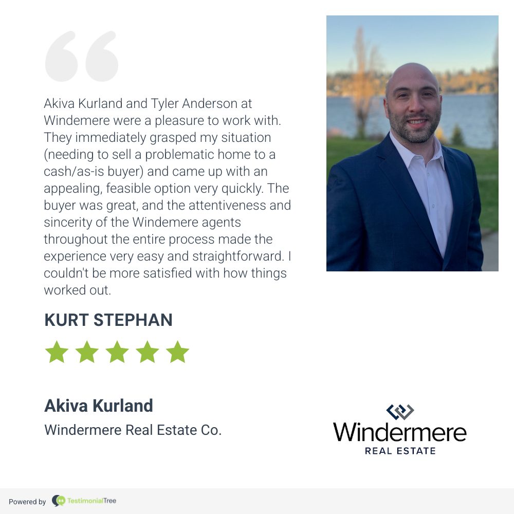 Akiva Kurland and Tyler Anderson at Windemere were a pleasure to work with. They immediately grasped my situation (needing to sell a problematic home to a cash/as-is buyer) and came up with an appealing, feasible option very quickly. The buyer was great, and the attentiveness and sincerity of the Windemere agents throughout the entire process made the experience very easy and straightforward. I couldn't be more satisfied with how things worked out.